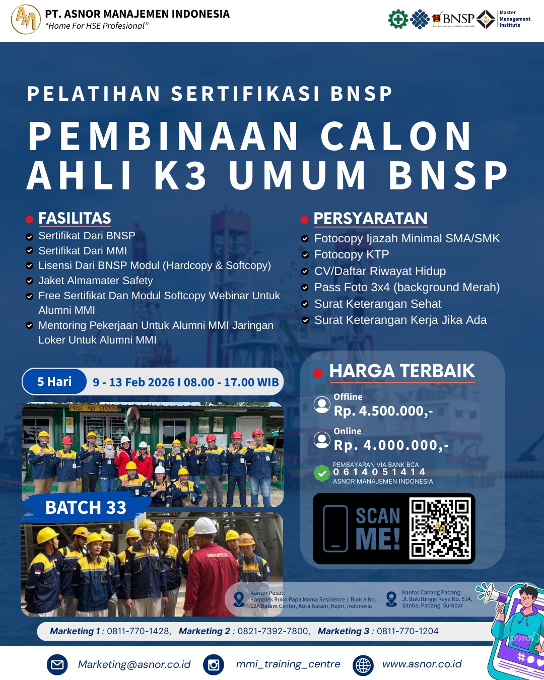 ASNOR MANAJEMEN INDONESIA adalah PJK3 yang mempersiapkan peserta training dalam melaksanakan ujian kompetensi AK3 Umum Sertifikasi BNSP bekerjasama dengan LSP K3 Nasional.