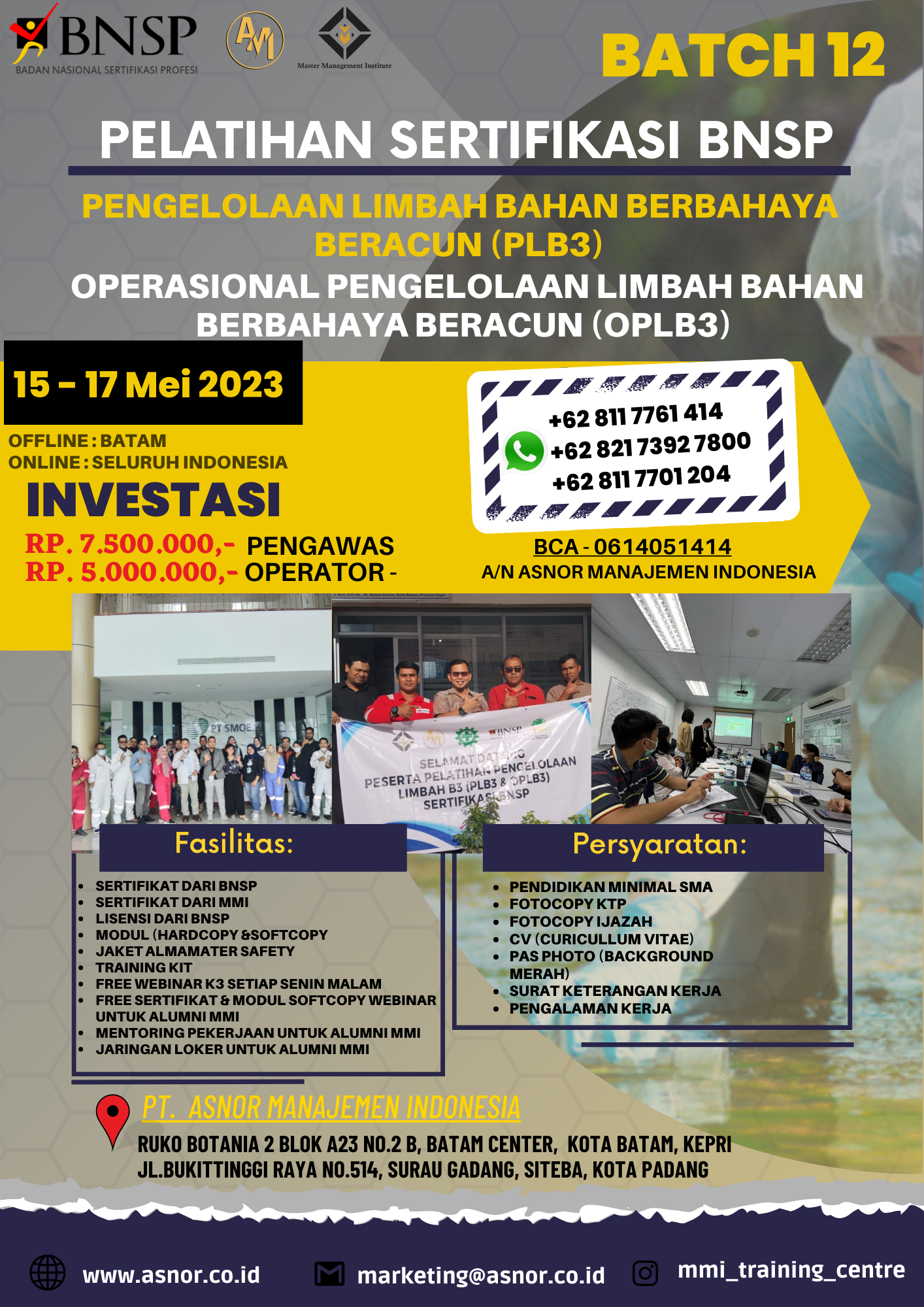MMI bekerja sama dengan LSP DAIMARU untuk mempersiapkan peserta training dalam melaksanakan ujian kompetensi PLB3. Pelatihan PLB3 mengacu pada Peraturan Pemerintah No. 22 Tahun 2021 & Peraturan Menteri LHK No. 6 Tahun 2021. Sertifikat Kompetensi PLB3 dikeluarkan oleh BNSP (Badan Nasional Sertifikasi Profesi). Berikut ini persyaratan Peserta TrainingPLB3 Sertifikasi BNSP Pendidikan dan Pengalaman