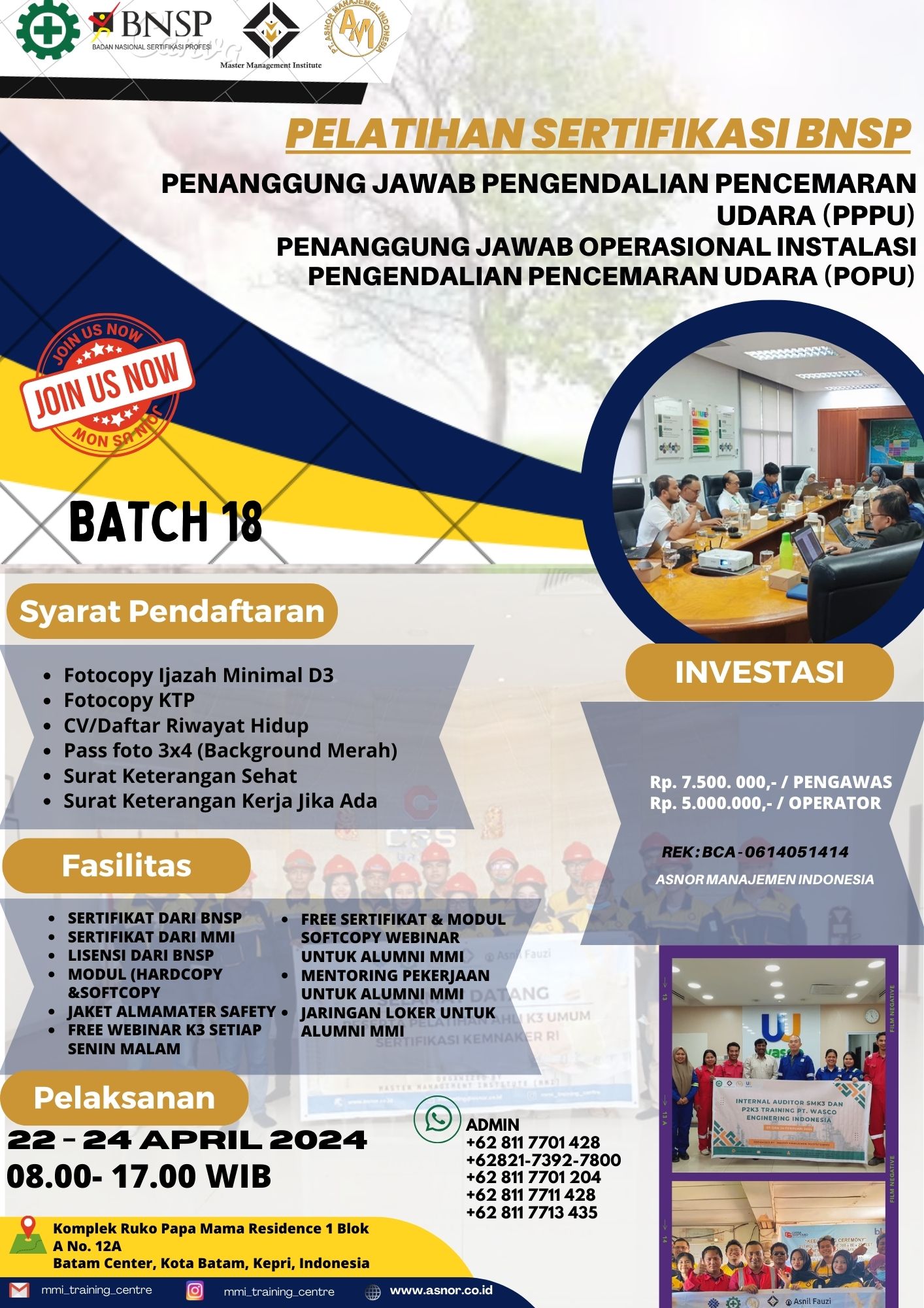 MMI bekerja sama dengan LSP DAIMARU untuk mempersiapkan peserta training dalam melaksanakan ujian kompetensi PPPA. Pelatihan PPPU mengacu pada Peraturan Pemerintah No. 22 Tahun 2021, Peraturan Menteri LH No. 5 Tahun 2006, Peraturan Menteri LHK Np. 11 Tahun 2021, Keputusan Menteri LH No. 13 Tahun 1995. Sertifikat Kompetensi PPPU dikeluarkan oleh BNSP (Badan Nasional Sertifikasi Profesi). Berikut ini persyaratan Peserta Training PPPU Sertifikasi BNSP Pendidikan dan Pengalaman